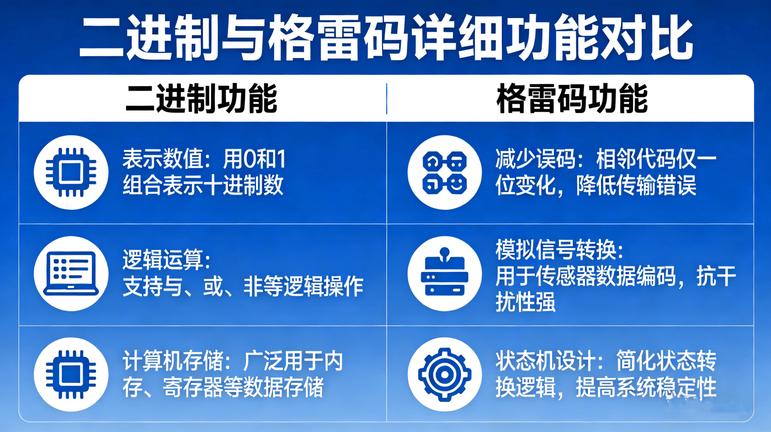答: 核心原因是避免临界值误码。二进制码中多个 bit 位可能同时变化(如从 0111到 1000),由于光电器件响应速度和机械安装的微小偏差,会在极短时间内读取到错误中间值。格雷码的相邻两个数字只有一位不同,彻底消除了多 bit 跳变带来的误码风险,保证数据绝对安全。